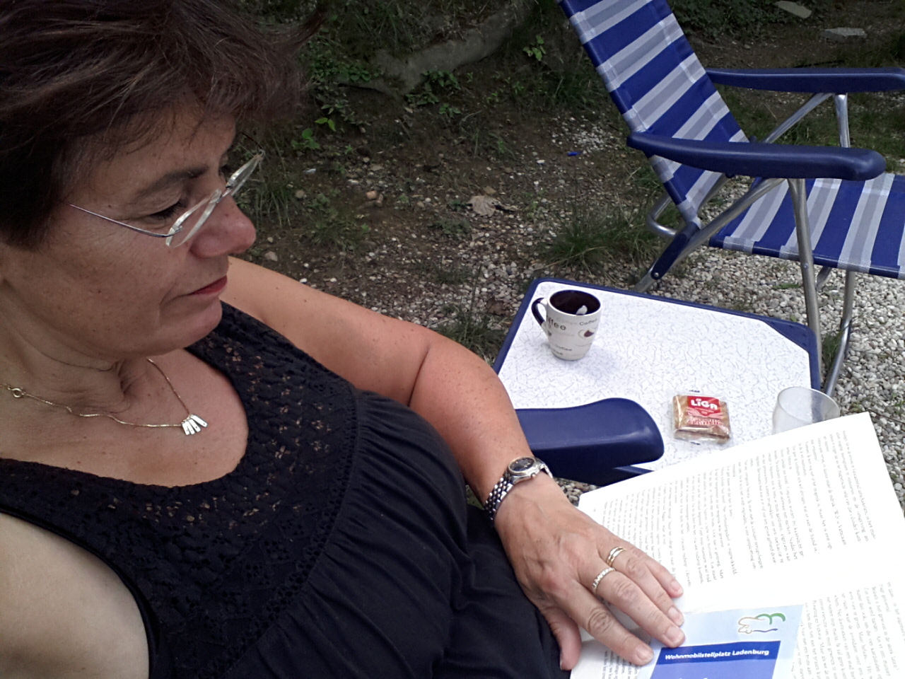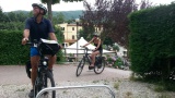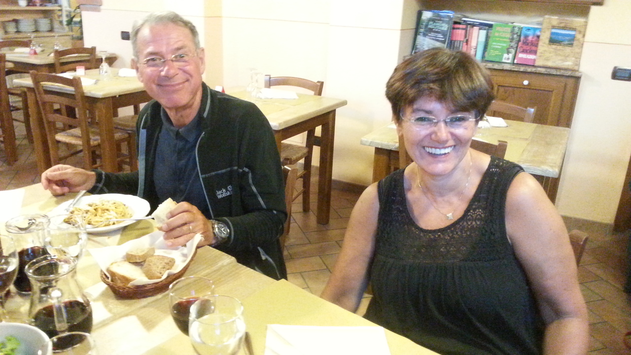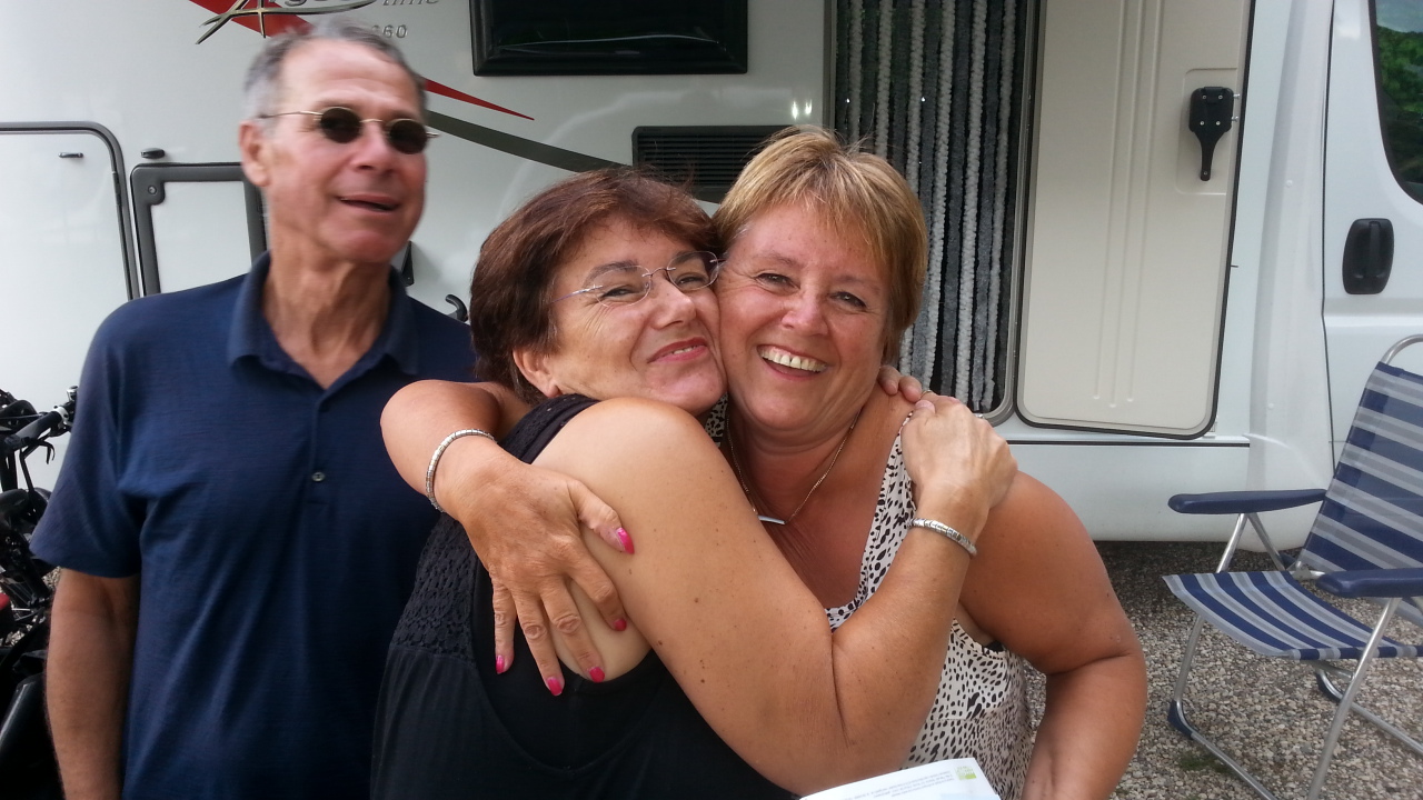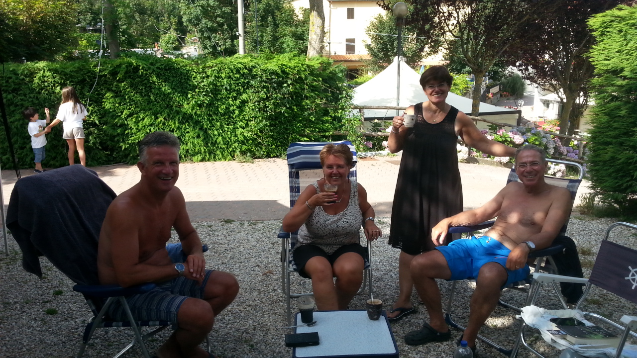 Rond half 11 vertrekken we samen van de camping ik moet eerst langs de lidl want we hebben niet veel voorraad meer. Het lukt me niet om er te parkeren want ik rij aan de verkeerde kant van de weg. Uiteindelijk beland ik op de parkeerplaats van een kantoorgebouw. Daar kan ik nog net keren en ik besluit om Bologne maar snel te verlaten. Om 12.00 uur kom ik op de volgende bestemming aan. De campingbaas rijdt me in een golfkarretje over zijn heuvelachtige terrassencamping en ik kies een mooi plekje dicht bij de ingang. Ik moet eerst een steil bergje op 25%. Er zitten wel 8 italiaanse mannetjes te kijken hoe ik dat doe. Het lukt. En na 10 minuten zit ik heerlijk te lezen. Rond 4 uur komt het fietsteam aan en als ze net zitten te vertellen en ik naar binnen ga om koffie te halen stopt het golfkarretje bij ons voor de camper en dan zie ik daar Diana (zus) en Dinand (zwager) in zitten. Ik kan mijn ogen niet geloven. ZO LEUK.We staan perplex en klappen en juichen net kleine kinderen. Surprise surprice. Zij maakten een tussenstop op hun weg terug van Elba naar huis. Wat ontzettend gezellig, wat een superdag. We vertellen elkaar de vakantieverhalen en gaan savonds samen uit eten. Het is echt heel gezellig en we lachen wat af. Tot laat zitten we aan de wijn en dat is aan sommige wijndrinkers echt te merken. Helaas kwam aan deze mooie dag ook een eind en zo lig ik nu om 00.15 uur mijn verhaal nog te schrijven. Na mijn dip van gisteren zit ik nu boven op de top. Diana en Dinand hartelijk dank voor jullie verrassing en gezelligheid het was TOP.