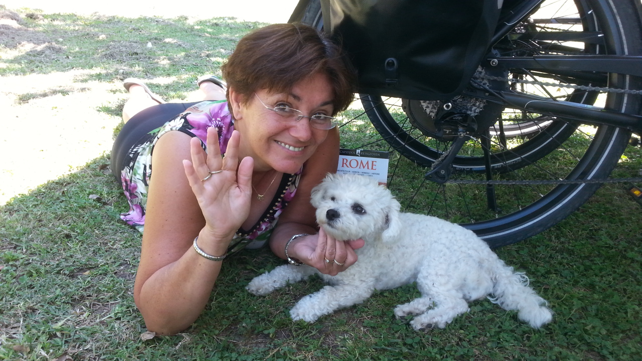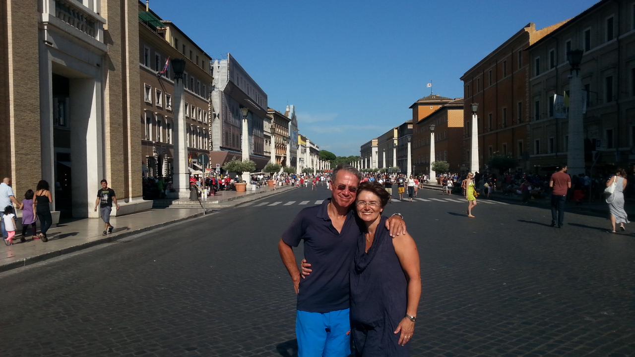 Voor ik het in de gaten had stond ik bij de camping voor de ingang. U heeft uw bestemming bereikt. God zij dank, dacht ik helemaal gelukt. Er klopte iemand op de deur en ik zag Peter die van (u bent toch niet de vrouw van....) ook zij hadden Rome gehaald. Mooi plekje gezocht, janine laten weten dat het goed gegaan was en met de trein en metro de stad in. Ik zag allemaal groepen met dezelfde tshirts duizenden duitsers en het st. pietersplein was afgezet. Het bleek een bijzondere dag te zijn want tussen 5 en 6 zou de paus op het plein verschijnen. Das een mooie ontvangst voor het fietsteam dacht ik zo. Alsof we het zelf geregeld hadden. En ja hoor toen ik om 4 uur lindy filmde die kwam aanrijden klonk uit de luidsprekers DU BIST DA. Hoe toepasselijk. En daar kwamen de andere 3 fietsers en er werd gezongen IHR SEID DA. En ik maar filmen want dat kwam precies op tijd. Wat was het bijzonder om daar in die drukte te staan maar al gauw benauwde het ook en zochten we een zijstraatje met een terrasje waar de fietsen geparkeerd konden staan. De beloofde pizzas smaakte uitstekend (112,--) en daarna heb ik nog naar de manifestatie op het plein staan kijken inclusief paus. Wel nog een bedankgebedje gedaan dat alles zo goed gegaan was. Toen afscheid nemen van fietsteam en ik met moontje met trein naar huis. Bij aankomst hadden we visite van peter en vrouw en hebben we nog gezellig met zijn allen buiten gezeten. Dit was mijn laatste verslagdag want vanaf nu ben ik gewoon weer passagier. Ik wil wel laten weten dat ik enorm genoten heb van al mijn fans en hoe bijzonder leuk ik alle reacties vond. Ik heb nog nooit zoon vreemde vakantie gehad en het met zo velen gedeeld maar ik heb genoten! Veel liefs van Mona en Els.